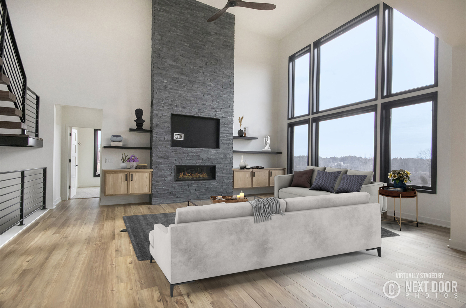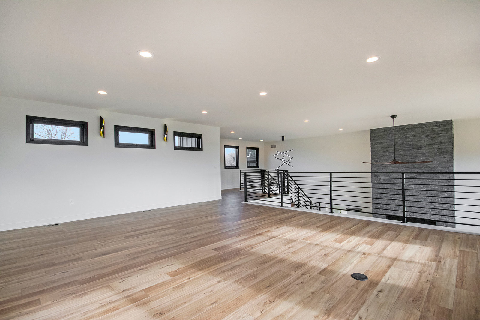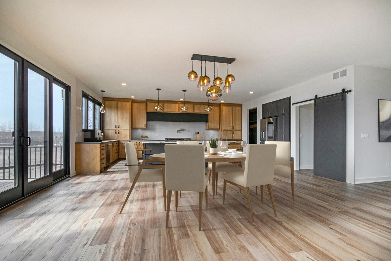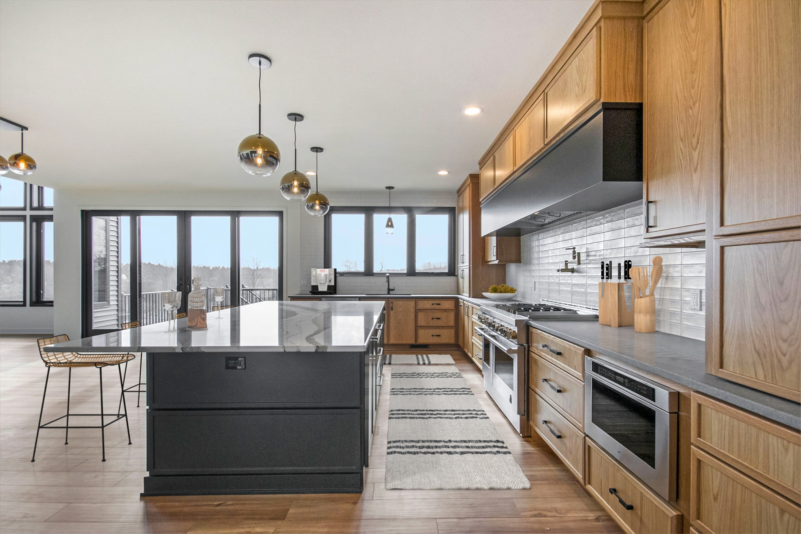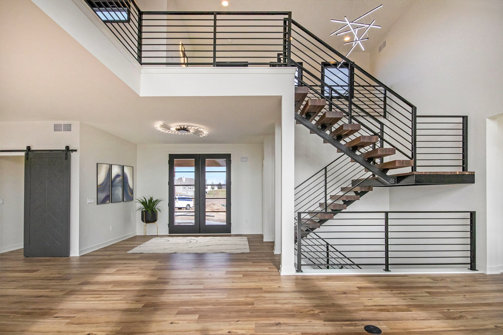 Nestled on 80 acres of rolling hills with a pond and rich wildlife, this stunning home boasts 4,400 sq. ft. of modern design. The two-story-high great room has a floor-to-ceiling black stone fireplace and features a floating stairway with Walnut steps that lead to a spacious office loft. You will find custom cabinetry throughout the home and Cambria quartz countertops. The basement houses the bar, theater room, exercise room, and a junior suite. A fun fact is that this home has a hidden passage into a “secret poker room.”