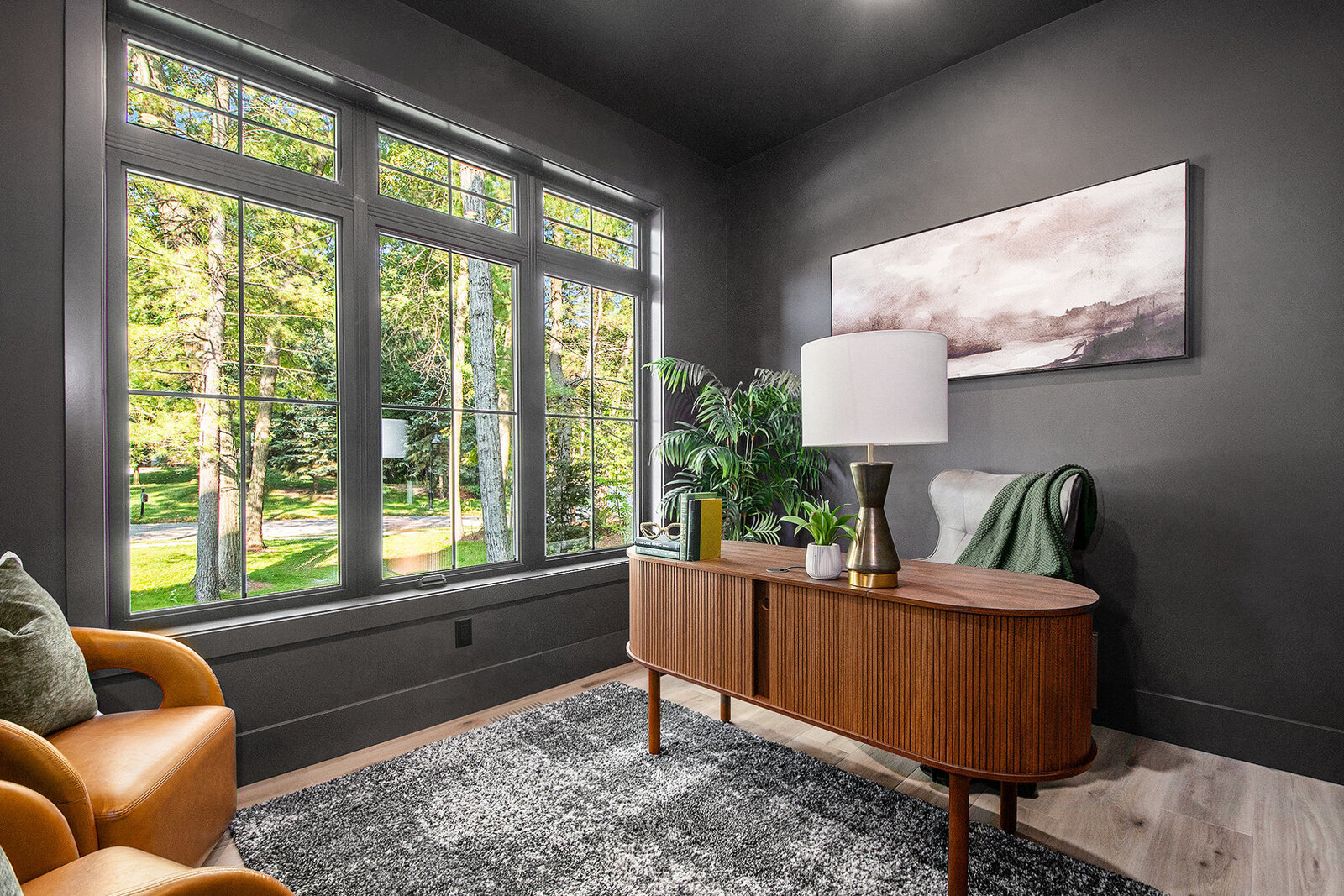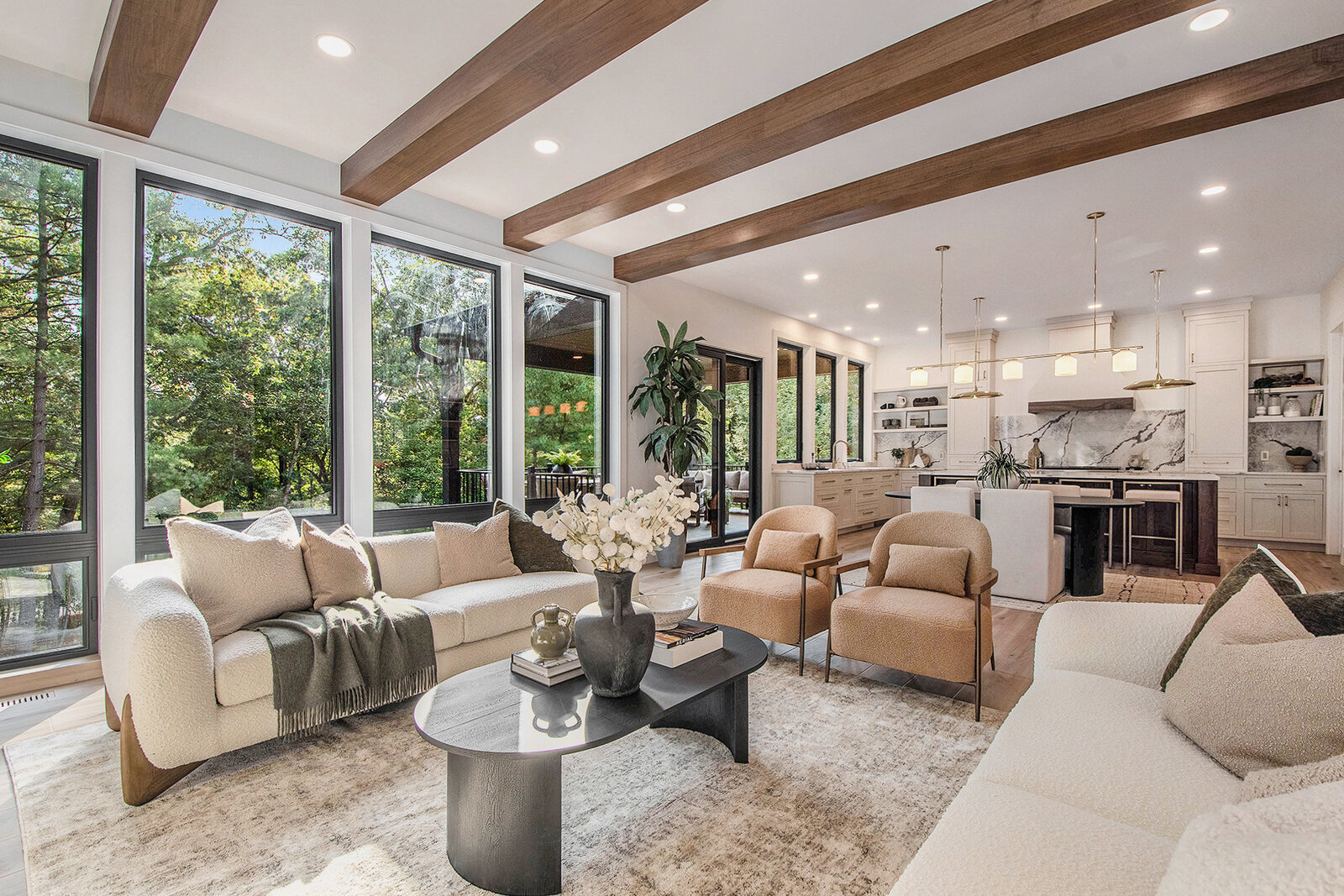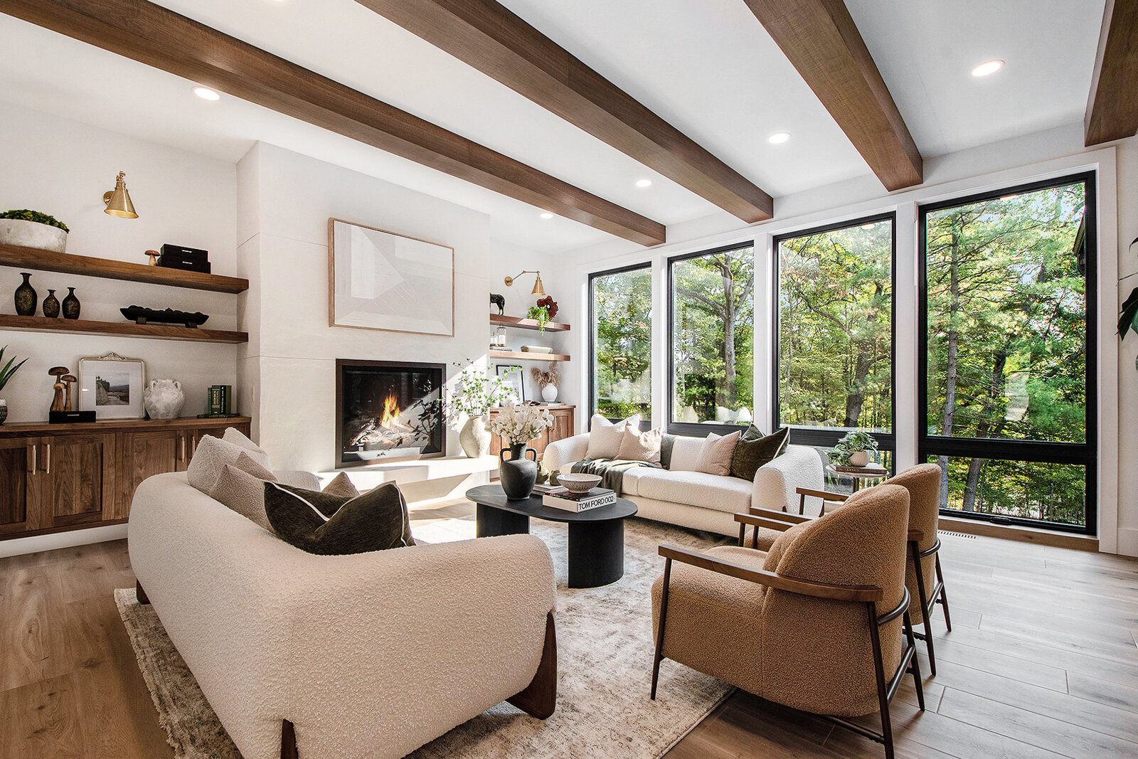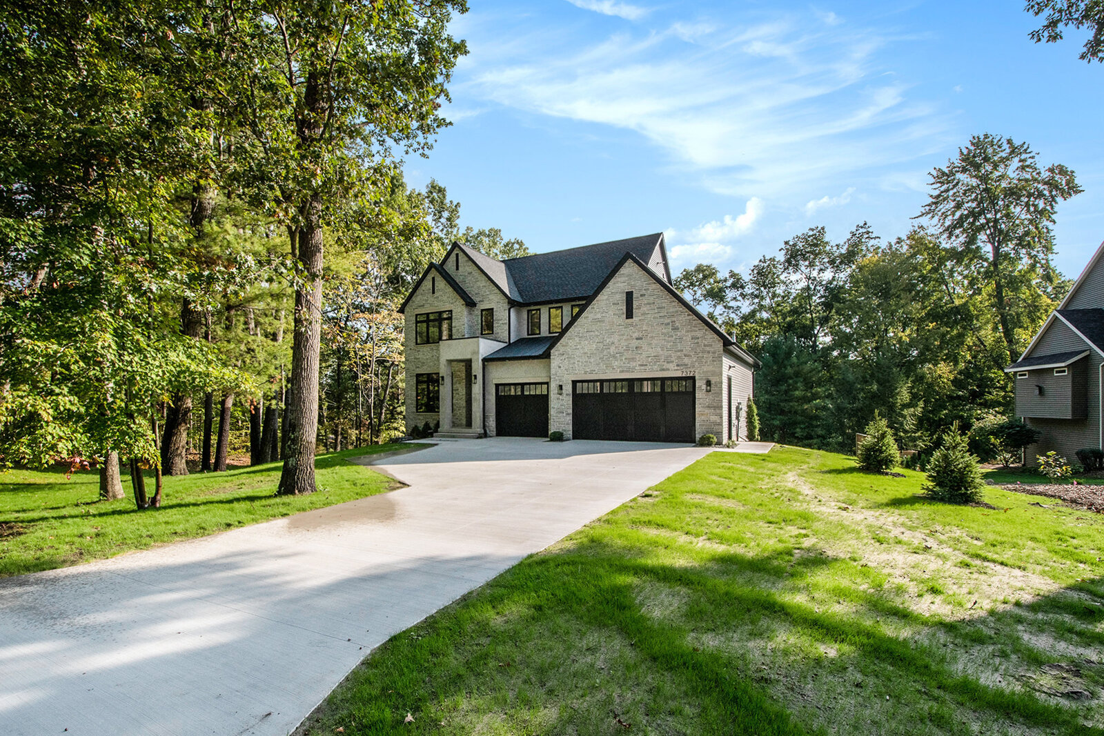 This 5-bedroom + office, 5.5-bathroom home is designed to impress! Step into a sun-drenched living room featuring floor-to-ceiling windows framing uninterrupted wooded views and a cozy fireplace. The open-concept kitchen boasts chef-grade appliances, expansive windows, a walnut center island, and a spacious butler’s pantry that seamlessly connects to the mudroom and attached 3-stall garage. The primary suite features vaulted ceilings and a luxurious en-suite bath with dual vanities, a tiled shower with rainhead and dual shower heads, and heated tile floor in the bathroom. The finished walkout lower level provides even more living space with a spacious rec room, 5th bedroom, additional 1.5 bathrooms, and a 19ft x 19ft bonus area perfect for a golf simulator, home gym, or extra storage.